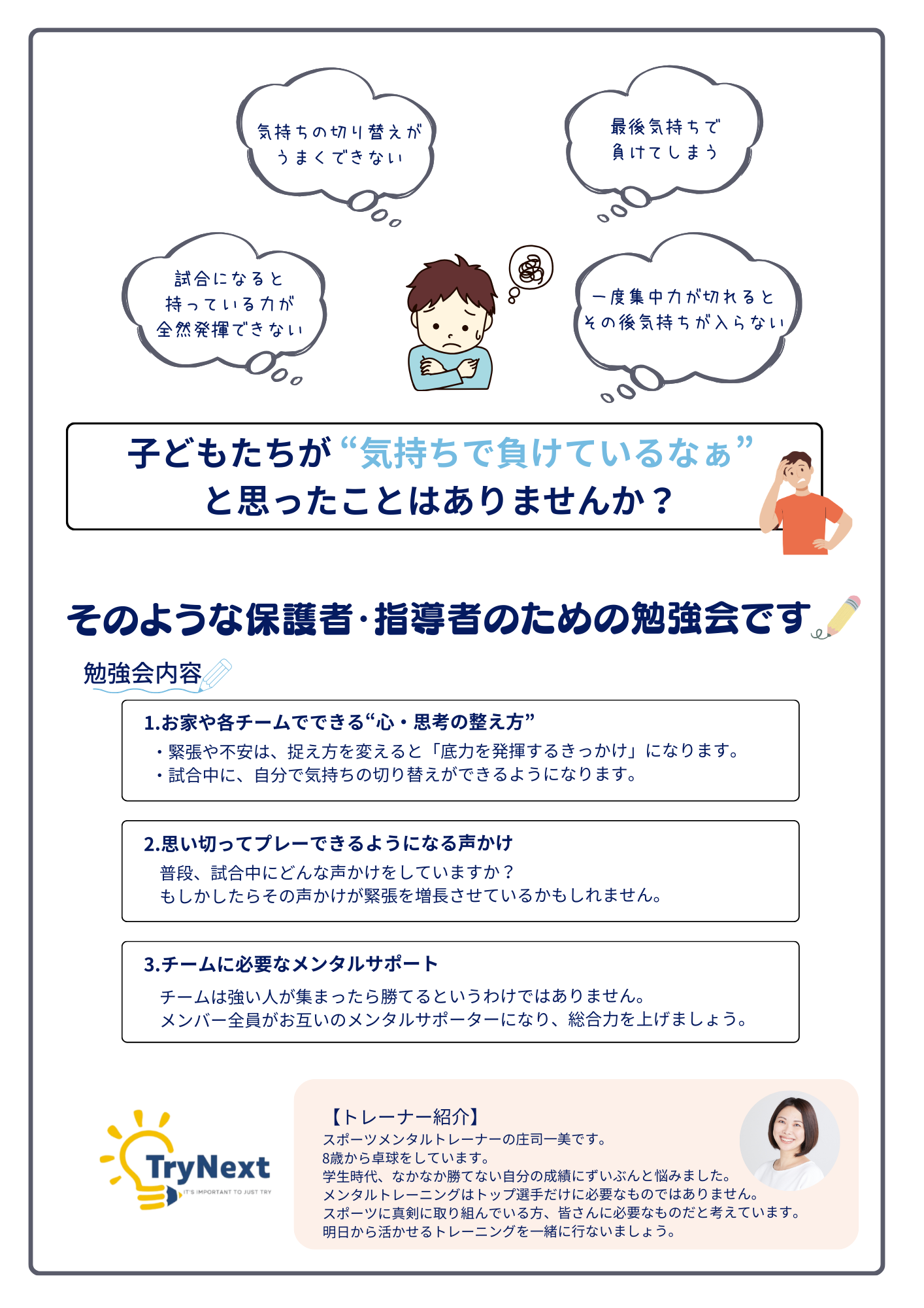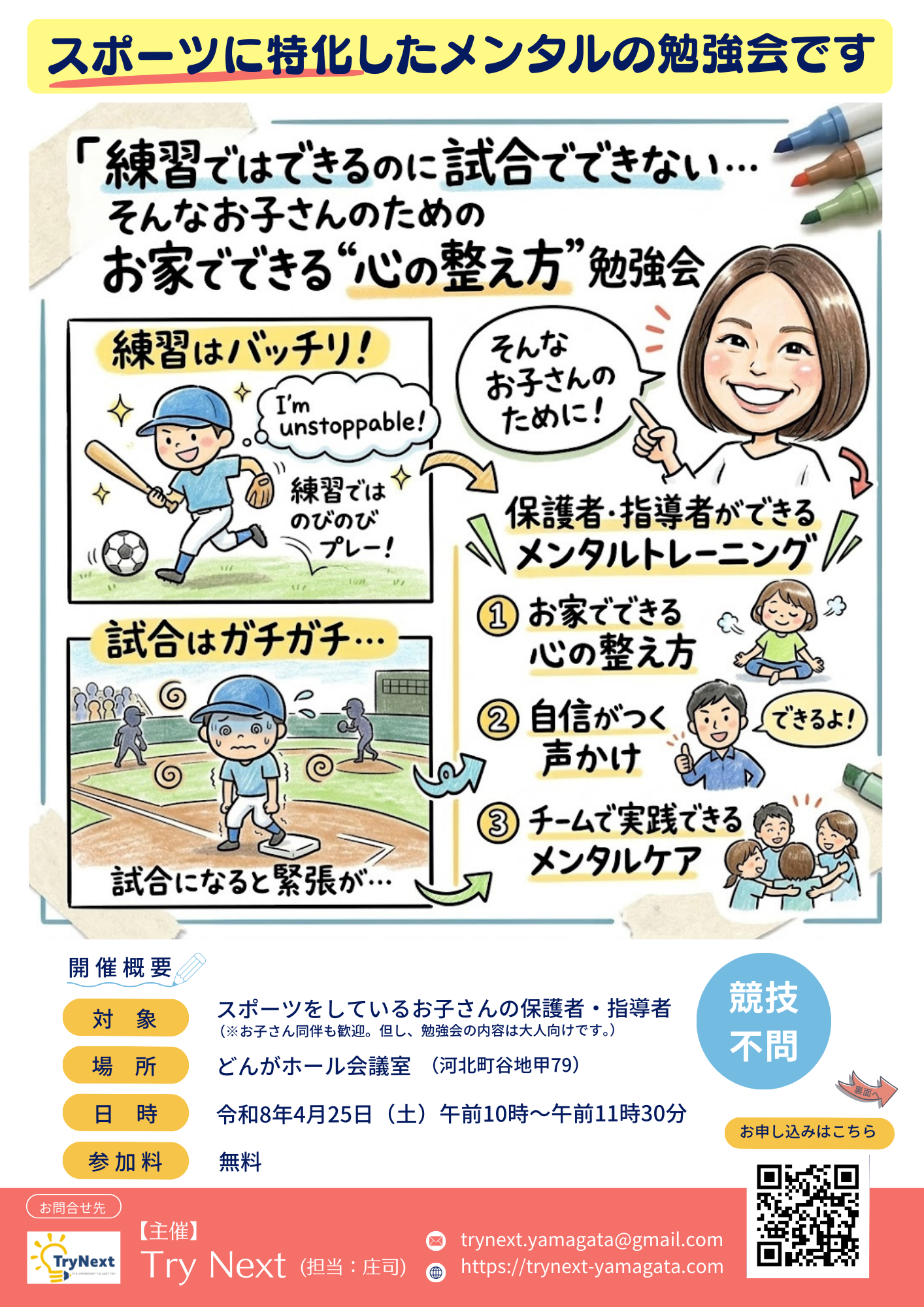 2026年4月25日(土)に、スポーツを頑張る子どもたちの保護者・指導者向けの「お家でできる”心の整え方”勉強会」を開催します!